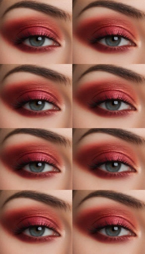 This bold look features a smoldering blend of deep red hues, creating a sultry, monochromatic finish. Perfect for evening events in the summer, it exudes confidence and drama.